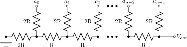 Selon la logique de l’arithmétique binaire, on comprend que la fidélité de la conversion sera liée au fait que chacune des sources de tension soit très précisément le double de la tension de la source représentant le bit immédiatement inférieur. On utilise pour réaliser ces sources de tension des ponts diviseurs de tension à base de résistances. De l’étalonnage précis de ces résistances dépend la monotonicité du DAC. Atteindre une telle précision dans ce domaine est très compliqué et très couteux. En effet, il faut régler sur chaque microprocesseur les minuscules potentiomètres correspondant à chacun des bits avec un tout petit tournevis. Paradoxalement, cette précision est d’autant plus importante pour la tension la plus élevée représentant le bit de poids fort (MSB – most significant bit) car c’est ce MSB qui représente le signe du signal et est donc très sollicité sur les tout petits signaux. On doit atteindre, dans le cas du 16 bits, pour la tension du MSB une précision supérieure à la valeur du bit de poids le plus faible (LSB – less significant bit) c’est à dire 1/32268e, soit environ 0.002%.