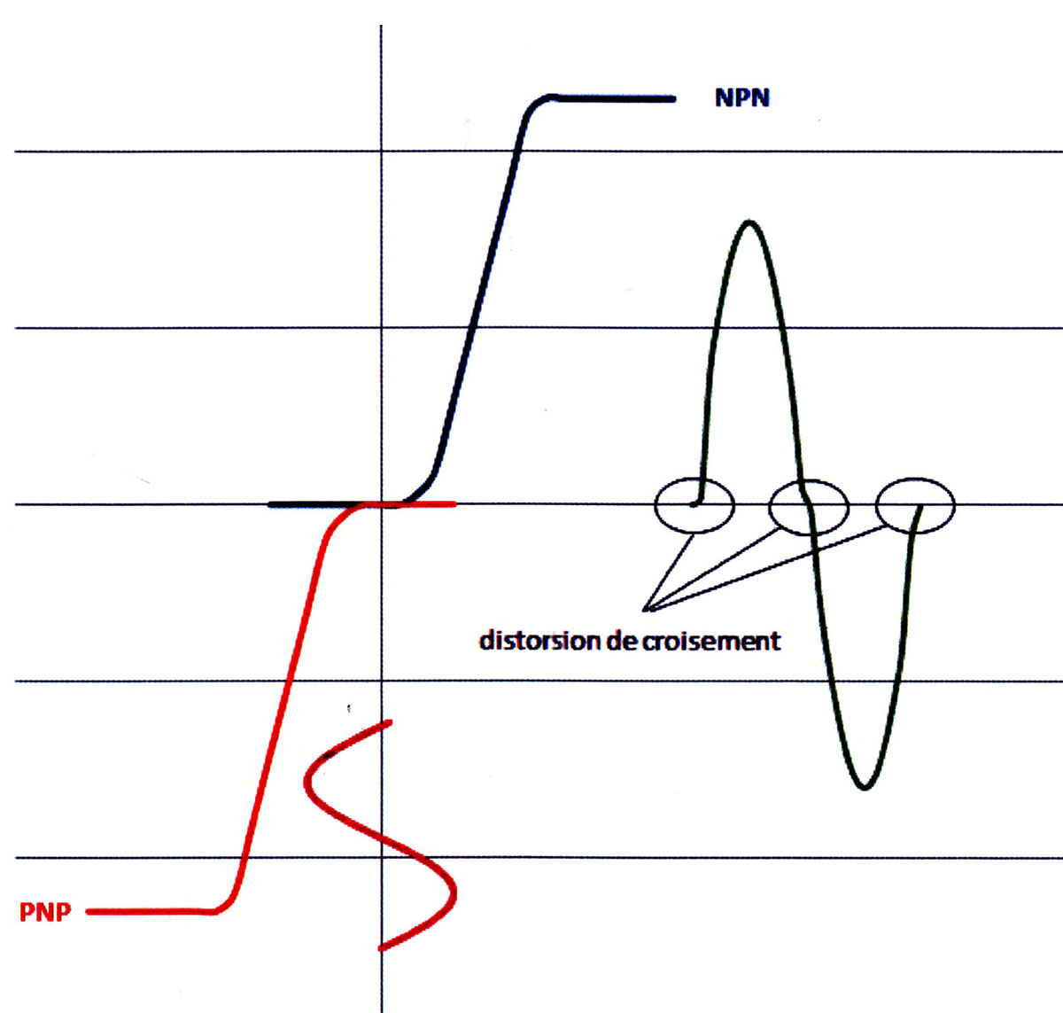 Une solution plus efficace est d’utiliser deux transistors complémentaires (NPN et PNP) pour amplifier respectivement les alternances positives et négatives du signal. C’est la classe B qui est affectée en pratique d’une distorsion dite de croisement car les transistors ne sont pas immédiatement actifs et linéaires dès le point zéro de leur courbe. En pratique, on polarise plus ou moins légèrement chacun des transistors de façon à ce que le point de repos soit dans le bas de la partie linéaire de leur courbe. C’est la classe AB. Suivant le choix du niveau de polarisation, le rendement varie évidement mais disons qu’il sera proche de 50%. Les puristes relèveront les risques de dégradation du résultat auditif provenant de deux transistors de technologies différentes (NPN et PNP) pour chacune des demis alternances et du fait que le fonctionnement oscille entre l’utilisation d’un transistor pour les tensions élevées et de deux en parallèles sur les tensions faibles.