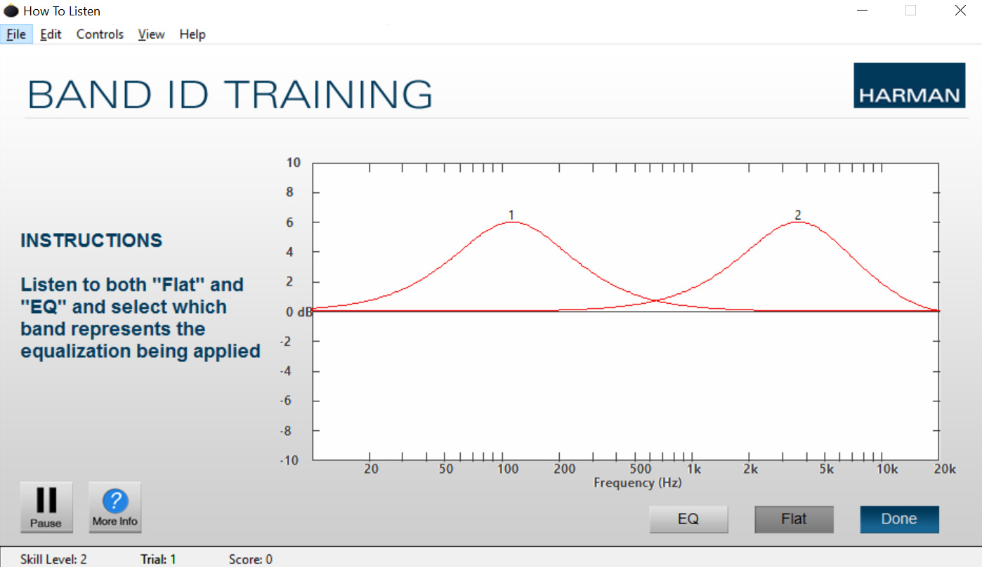 De quoi s’agit-il ? How To Listen est un petit logiciel qui demande à l’auditeur de reconnaître différentes caractéristiques sonores. Au fur et à mesure de ses progrès, l’auditeur accède à des niveaux de plus en plus difficiles. Par exemple, le premier exercice est d’identifier la fréquence d’une égalisation de +6dB. Le premier niveau propose le choix entre deux fréquences. On imagine, à raison, que c’est un jeu d’enfant. Quand le niveau augmente, le nombre de fréquence et le Q s’accroît, et quand on descend sous l’octave et qu’on mélange pics et creux, le jeu commence sérieusement à se corser.