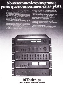 Dans ses publicités d’époque, Technics ventait la possibilité, grâce à cette gamme flat-line d’investir progressivement dans les éléments en fonction de ses besoins. Fin  1977 la configuration de base revenait à 2470 frs pour le préamplificateur et 2770 frs pour l’amplificateur. A cela s’ajoute l’égaliseur – 2660 frs – , les  vumètres – 1980 frs- et le tuner – 2910 frs.  Soit pour notre petit ensemble en double mono plus de 15000 frs. Haut de gamme vous dit-on !