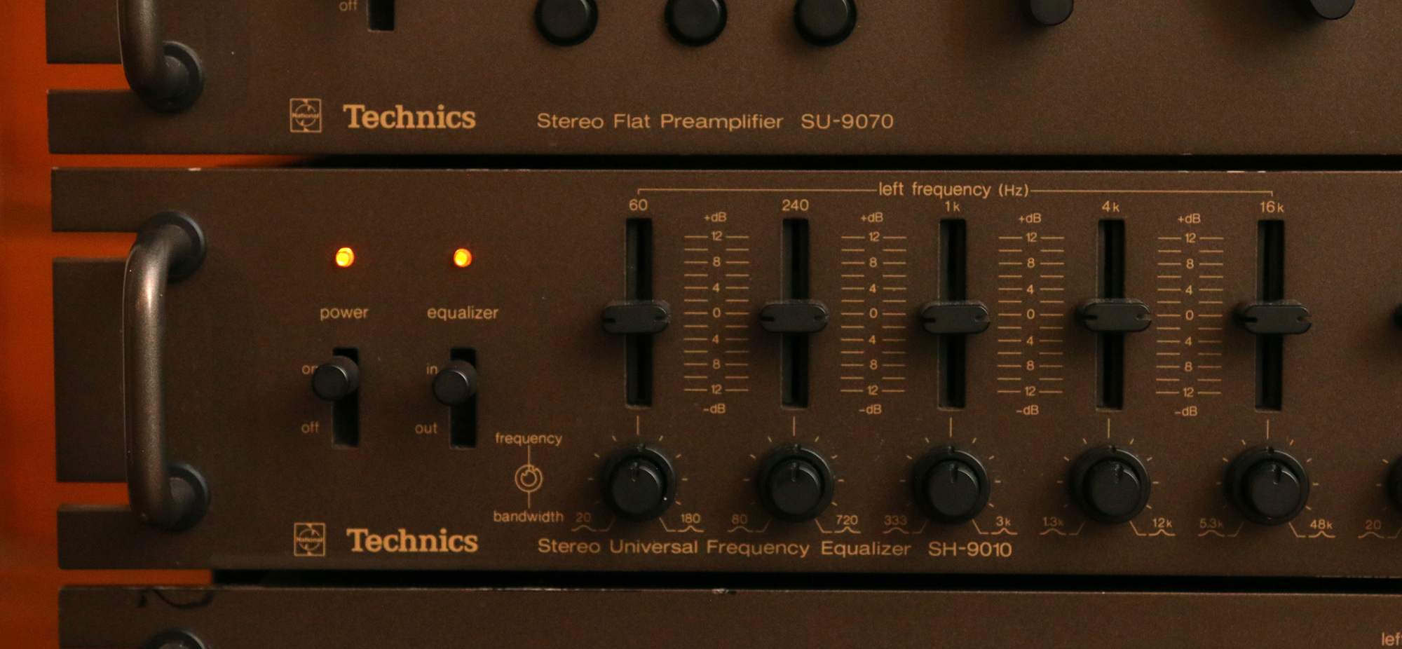 (2) Technics est l’auteur à la même époque du sommet du genre avec le SH-9090. L’appareil est assez équivalent au SH-9010 à la différence que les dix bandes de correction ne concerne qu’un seul canal et que le boitiers est sensiblement plus gros. Évidement, en stéréo, il faut deux SH9090.
