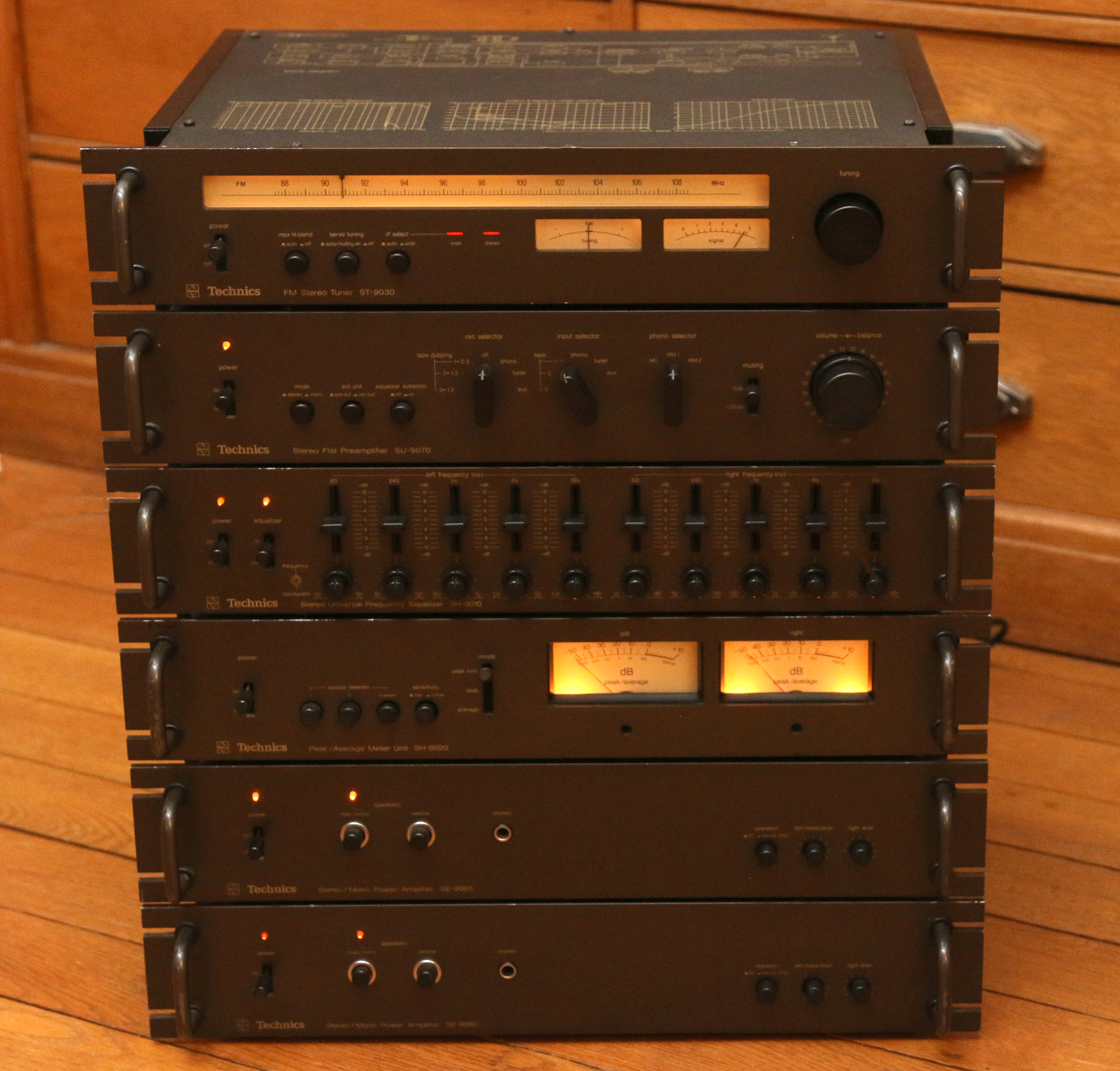 Mais maintenant comment appâter les amateurs de vumètres et de correcteurs de tonalité, sans dissuader les tenants de la « simplicité gage de qualité » ? En proposant pour chacune de ces fonctions un appareil adapté. La gamme « professional » flat-line comprend donc trois appareils de plus. Le correcteur de tonalité SH-9010, le bloc de mesures SH-9020 et le tuner ST-9030.  À ce stade, et si l’on compte les trois éléments précédemment décrits – préamplificateur et deux amplificateurs monophoniques – on arrive à six éléments pour faire ce que fait un gros ampli-tuner. La flat-line c’est transformé en mille-feuille. Et encore, on est soulagé d’apprendre que Technics a omis les référence 9040 et 9050. Quoique… En effet, le mode bridgé fait perdre à l’utilisateur la possibilité d’utiliser un casque. Qu’à cela ne tienne dirait Archibald, prenons un troisième SE-9060 pour servir d’amplificateur pour casque. Nous préférerons quant à nous rester raisonnable.  Mais pour poursuivre dans la logique modulaire, Technics aurait pu proposer un amplificateur casque SE-9040 et pourquoi pas un filtre actif SH-9050 pour pouvoir passer en amplification active. Pour ce dernier, il existe bien sous la référence SH-9015 ! Mais ce dernier est rarissime. De même par rapport au canon de l’époque, il manque un magnétophone à cassette. Après 1978, l’ensemble « professional series » sera souvent présenté avec le magnétocassette RS-M85, un peu plus récent (et à peine plus épais).