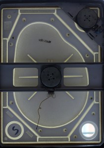 Le problème avec ces enceintes Bertagni, c’est que la mise au point a été totalement empirique. On le voit au travail sur les épaisseurs des panneaux de polystyrène mais cela concerne aussi le couplage entre le moteur électrodynamique et le panneau ainsi que celui entre le panneau et son cadre. Hors, si le polystyrène est un matériau relativement inerte dont les propriétés mécaniques évoluent peu, on peut se poser des questions sur les adhésifs utilisés pour les couplages. En l’absence de données sur ces colles, on laissera les choses telles qu’elles sont mais on n’aura pas la garantie de retrouver les performances d’origine. On vérifiera cependant que les excitateurs restent parfaitement solidaires des panneaux.