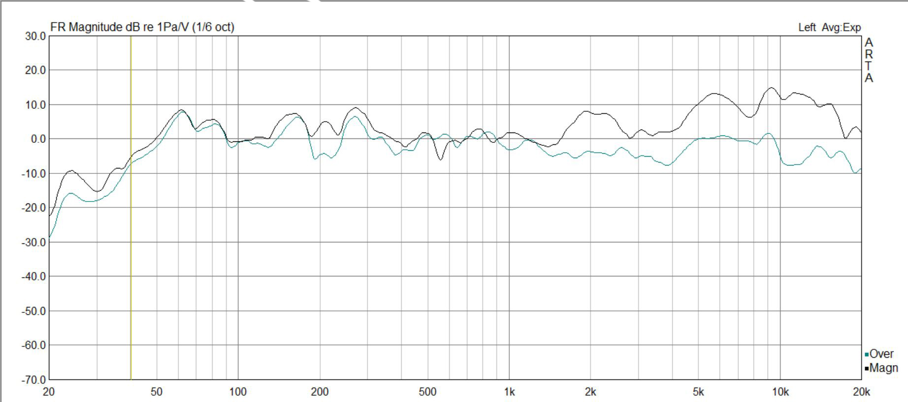 La courbe de réponse est assez étendue bien qu’irrégulière. La courbe bleu est dans l’axe à un mètre. La courbe noire montre l’apport de la partie tweeter du panneau par une mesure face à cette zone.