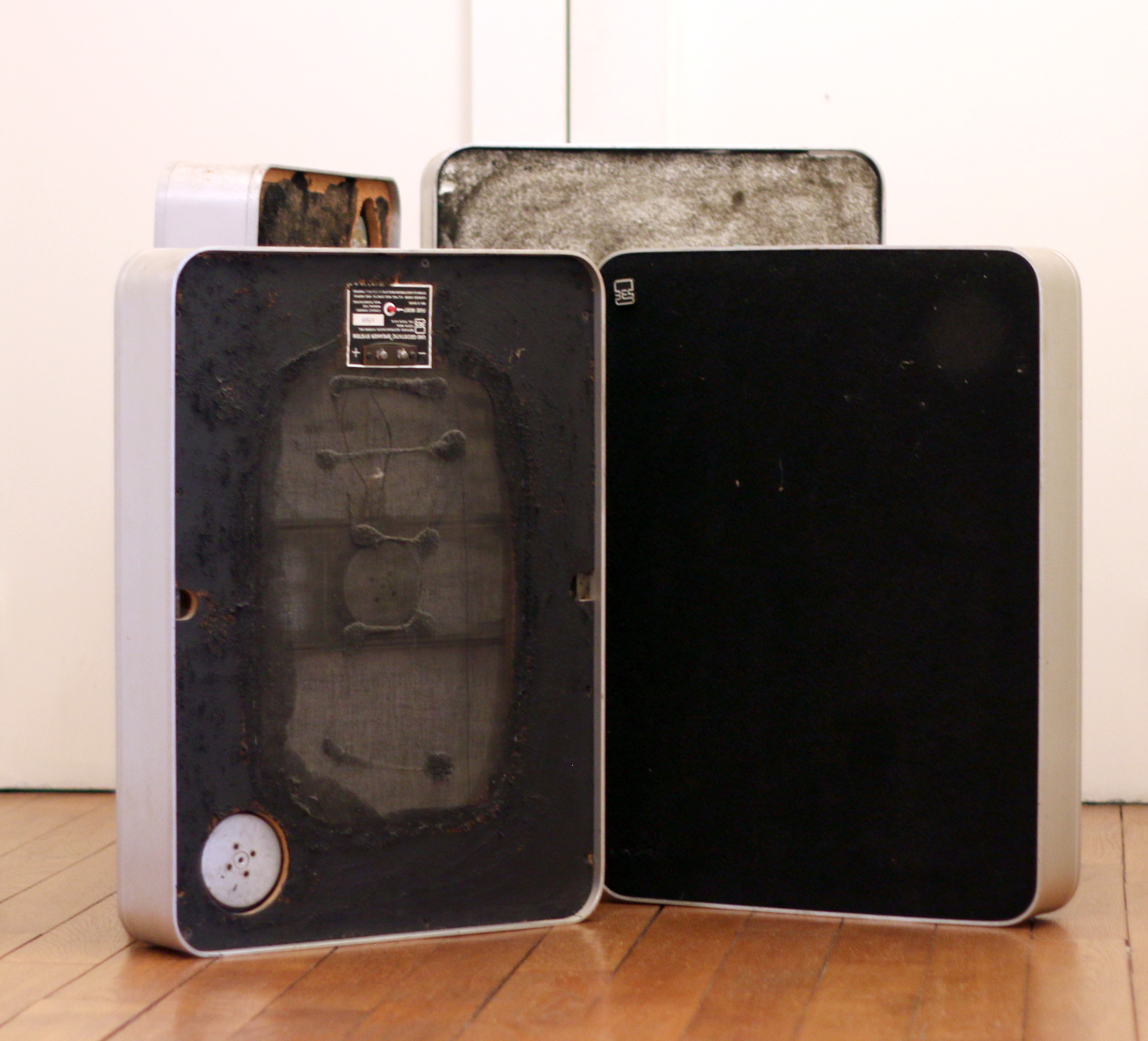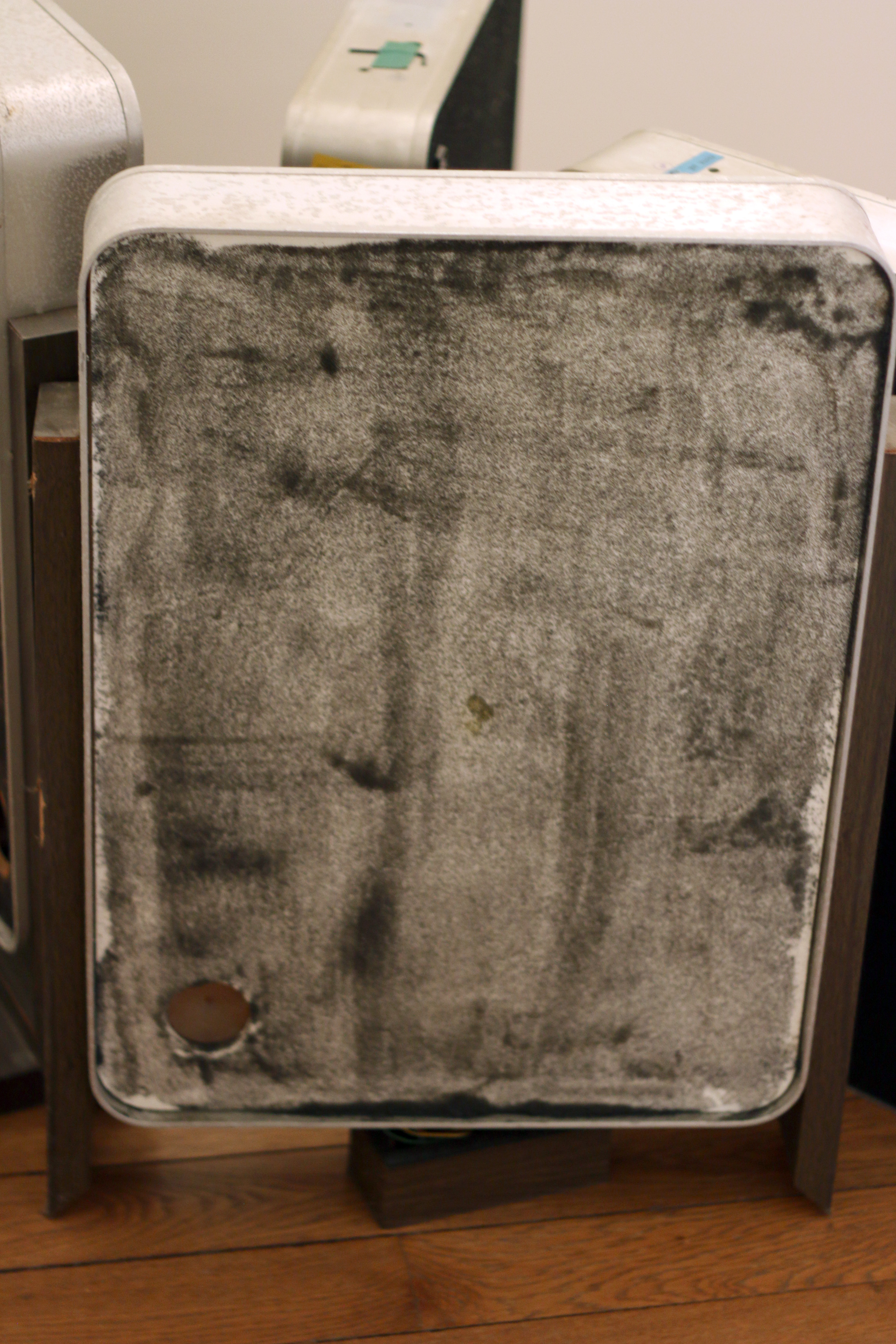 L’atmosphère humide de la cave n’a pas fait de cadeaux aux Bertagni. Leur apparence est pitoyable. Les pieds en aggloméré ne sont plus agglomérés du tout et on se retrouve avec une poussière de bois. La mousse acoustique qui recouvre les deux faces des enceintes a suivi le même chemin et l’aluminium brossé qui encadre les enceintes est fort piqué.
