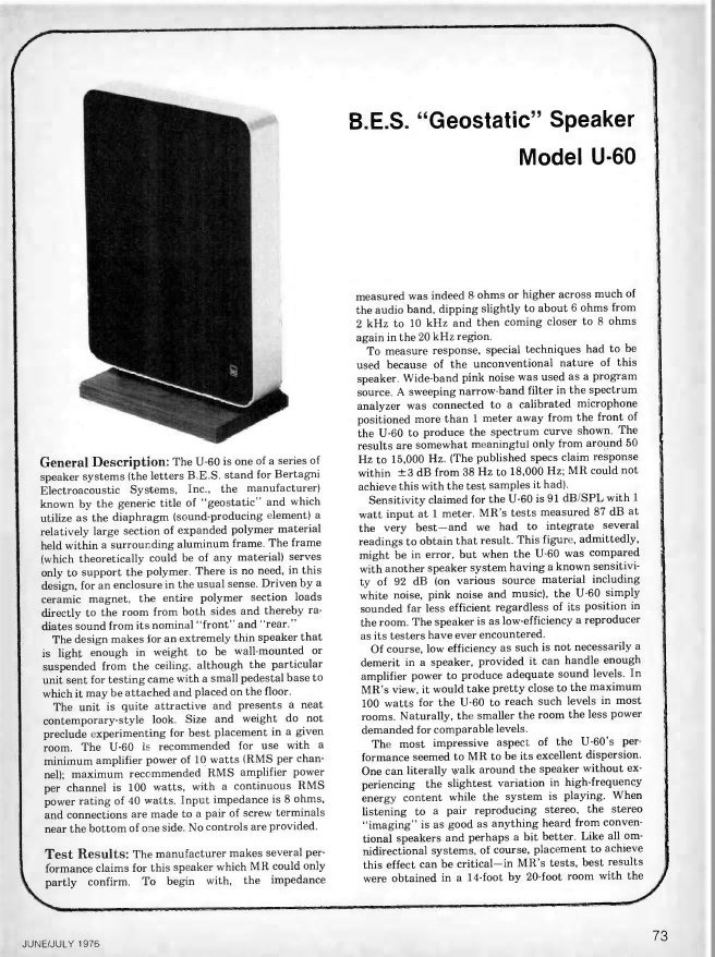 Mais à quoi ressemblent donc ces « fameuses » enceintes BES ? À la suite de Yamaha et de ses NS-250, Bertagni est un défenseur des panneaux diffusants. On est assez proche de ce que fera par la suite la société NXT. Espérons que les résultats auditifs seront meilleurs que nos expériences récentes en la matière!