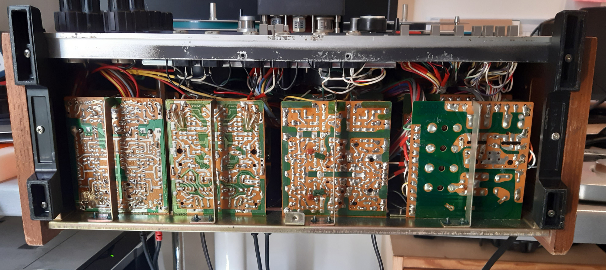 Par contraste avec la face avant où les commandes sont éparpillées, la construction interne du 3340s est fort bien organisée pour une maintenance aisée. Sous le capot supérieur, on trouve toute la partie mécanique. Sous le capot du bas, on a toute l’électronique. Quatre cartes (bias, enregistrement et deux cartes pour la lecture) sont disposées sur un rack pour gérer une paire de canaux. Et le rack des canaux arrière est monté sur charnières pour un accès facile aux canaux avant. Sans avoir l’aura d’un Revox (mais avec la fiabilité en plus), ni la sophistication des gros Sony, le Teac est construit pour ce qu’il doit être : un excellent outil pour l’enregistrement.