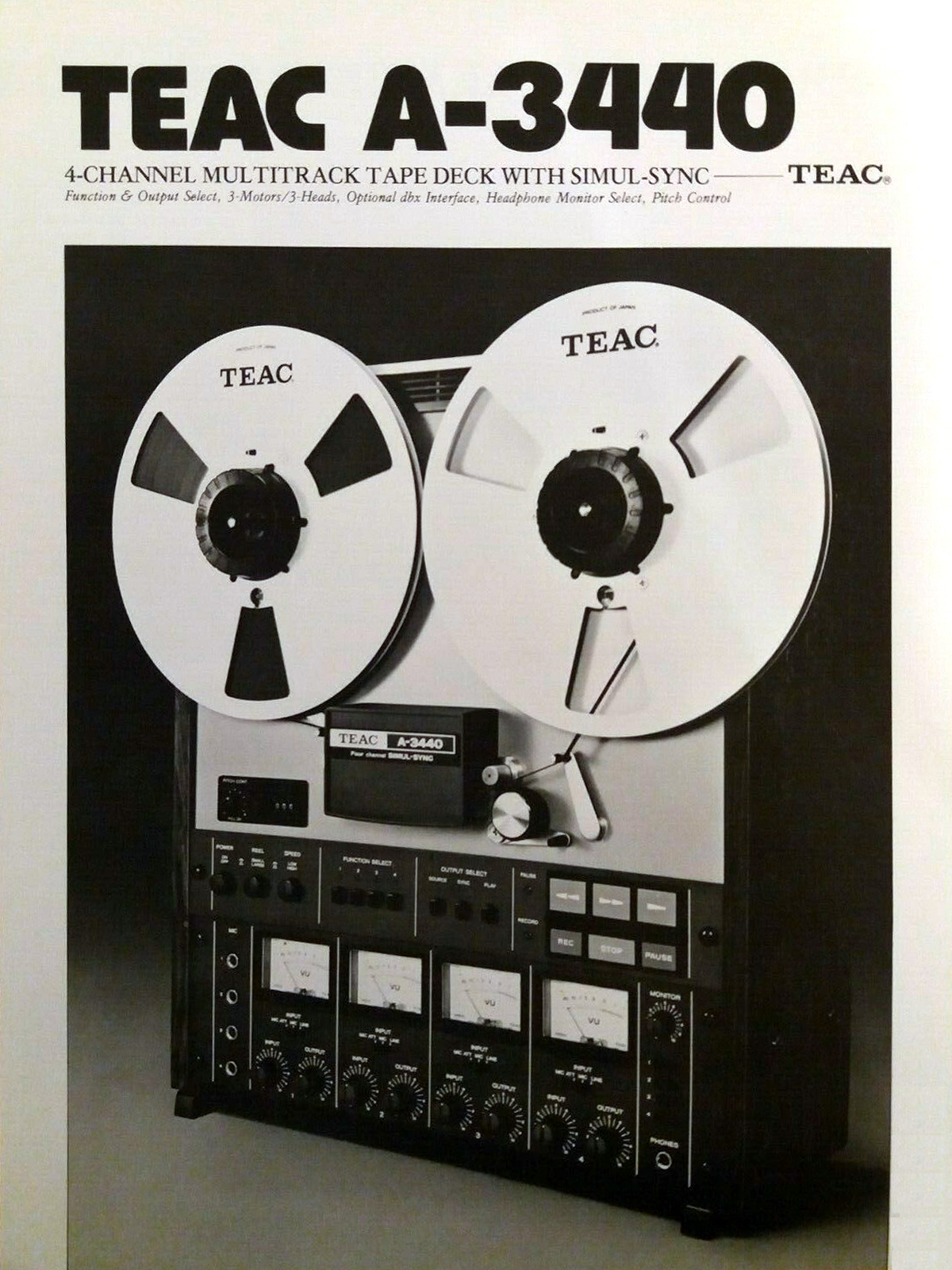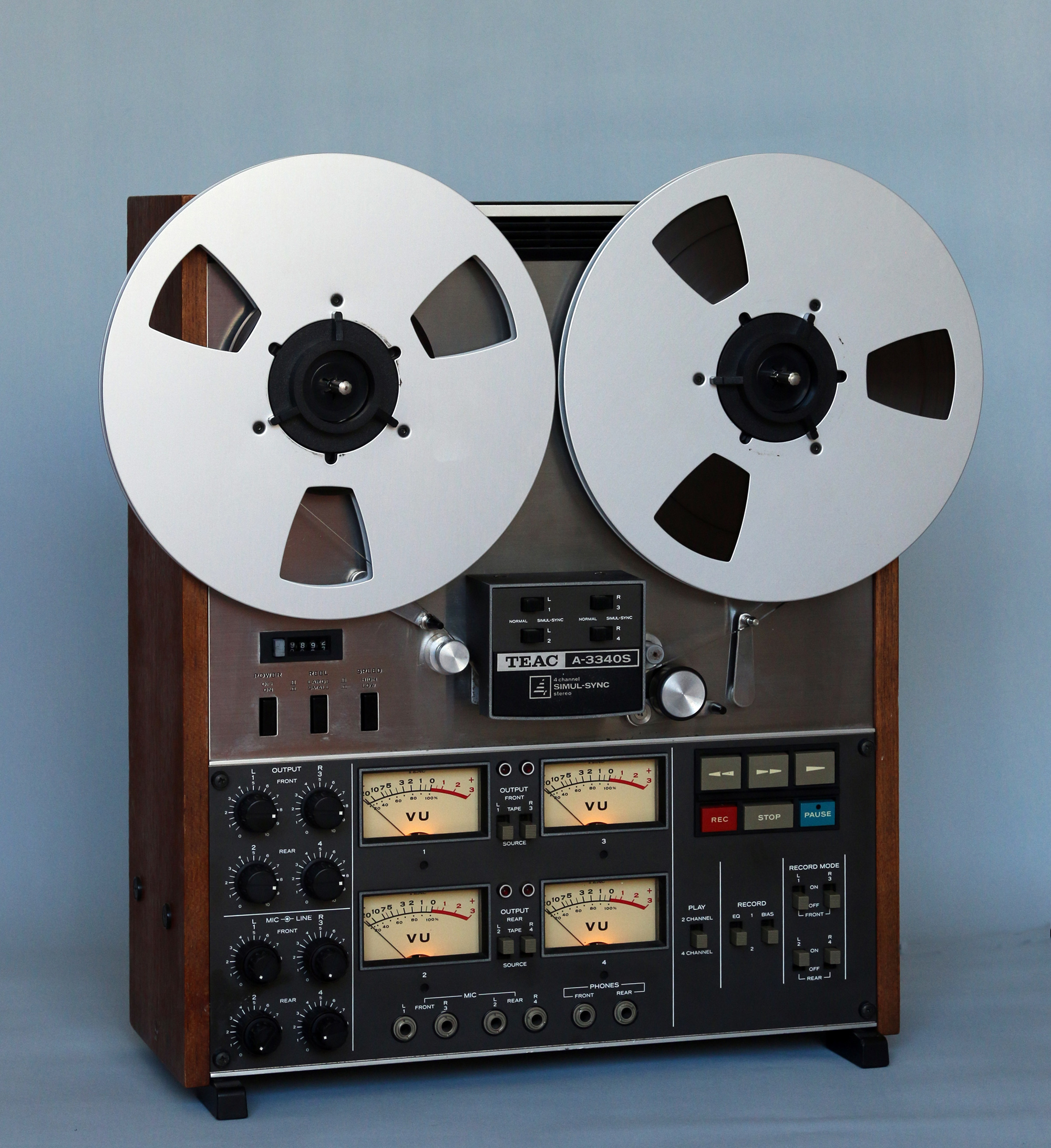 Ces magnétophones vont rapidement évoluer en version 3340s (et son petit frères 2340s) après quelques modifications, notamment celle du système de commande de défilement. Mais qu’est-ce qui rend ces machines, initialement destinées à la quadriphonie comme le montre la dénomination des canaux en « front » et « rear », aptes au home-studio? Rien du tout, ou si peu, un simple petit interrupteur. Cet interrupteur enclenche la fonction que Teac appelle simul-sync. Le simul-sync a pour effet de faire lire la bande magnétique par la tête d’enregistrement. Ce n’est pas idéal pour la qualité d’écoute puisqu’on sait que les largeurs d’entrefer optimales ne sont pas les mêmes pour l’enregistrement et la lecture. Mais cela permet d’enregistrer sur une piste de manière synchrone avec une autre piste en écoute. Pour ceux qui ont perdu l’habitude d’utiliser des magnétophones, on rappellera qu’il n’est pas possible d’enregistrer une nouvelle piste en se basant sur l’écoute d’une piste déjà enregistrée sans introduire un décalage temporel dû à l’espacement des têtes d’enregistrement et de lecture et à la vitesse de défilement de la bande. Avec le simul-sync, il est possible d’enregistrer d’abord certains instruments (traditionnellement la rythmique) puis d’enregistrer les pistes complémentaires en se basant sur l’écoute de la ou des pistes déjà enregistrées.