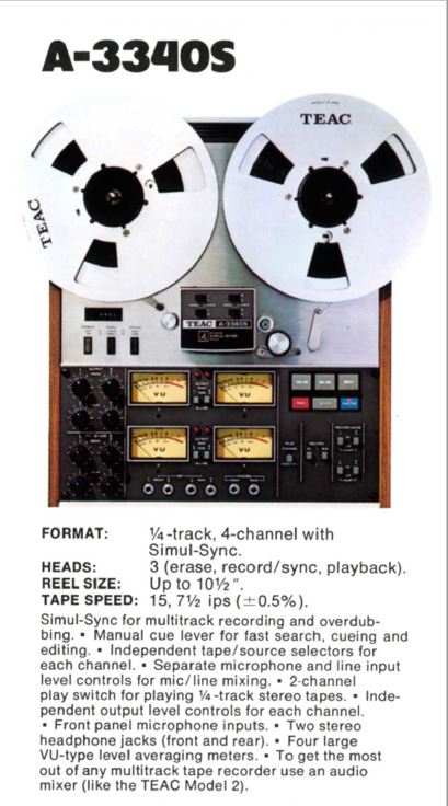 Au début des années 70, la quadriphonie est le nouvel eldorado des fabriquants de matériel et on voit apparaître des magnétophones véritablement quatre pistes sur le marché amateur. Ces magnétophones ne sont toujours pas des multipistes au sens studio du terme mais permettent déjà plus de choses. Parmi les leaders japonais de l’enregistrement magnétique, la firme Teac propose les machines quadriphoniques 2340 et 3340, la différence entre ces machines se situant sur la taille des bobines et la vitesse de défilement.