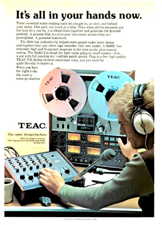 L’étape suivante de cette démocratisation, avant la révolution des DAW, sera lancée elle aussi par Teac/Tascam. Elle prend la forme en 1980 d’un enregistreur à cassette quatre pistes, premier d’une longue lignée, le célèbre portastudio 144. Mais cela est une autre histoire (3).