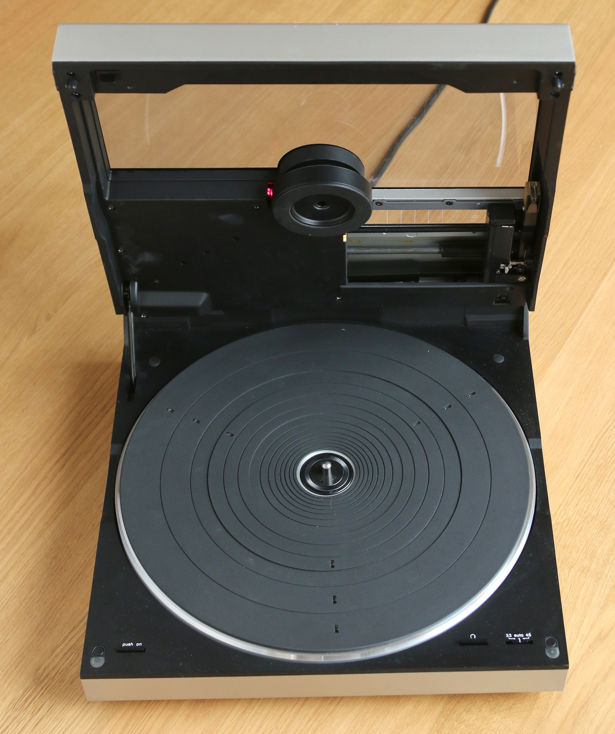 Ouvert, on constate qu’il y a vraiment peu de place perdue. On distingue sur le couvre plateau les neuf orifices qui permettent la détection de la taille du disque. Des petits boutons permettent les fonctions annexes : rotation du disque pour nettoyage, forçage de la vitesse de rotation.