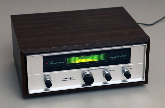 Voir cet appareil faire une intrusion dans un équipement de salon reste un mystère pour l’audiophile du XXIe siècle. Mais dans les années 70, Sansui proposa les RA-500/700 et Kenwood incorpora une réverbération à ressort au très désirable ampli-tuner KR-6170 « jumbo ». Mais le plus persévérant et le plus prolifique fut Pioneer qui proposa les SR-101 à tubes, SR-202, SR-303 (adapté esthétiquement à la période fluoscan) et SR-60. Une réverbération à ressort fut aussi incorporée dans l’ampli tuner SX-9000. Notre SR-202W est la continuation de la SR-202 avec un coffret en bois. Elle est restée disponible jusqu’en 1977.